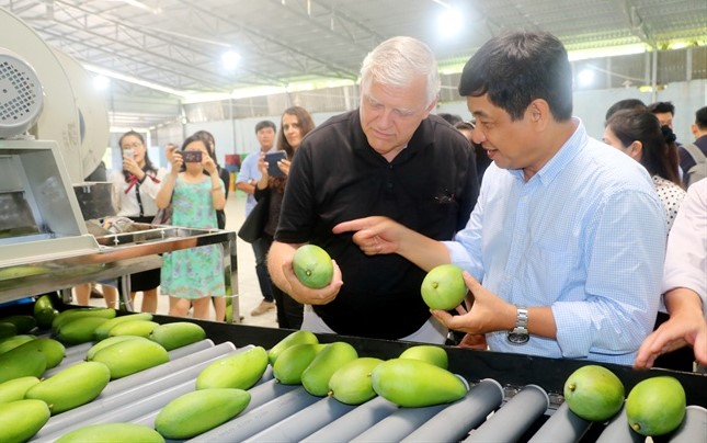 Nhờ kỹ thuật bao trái hiện đại, người nông dân làm ra được 2 loại xoài Cát Chu da xanh và da vàng.